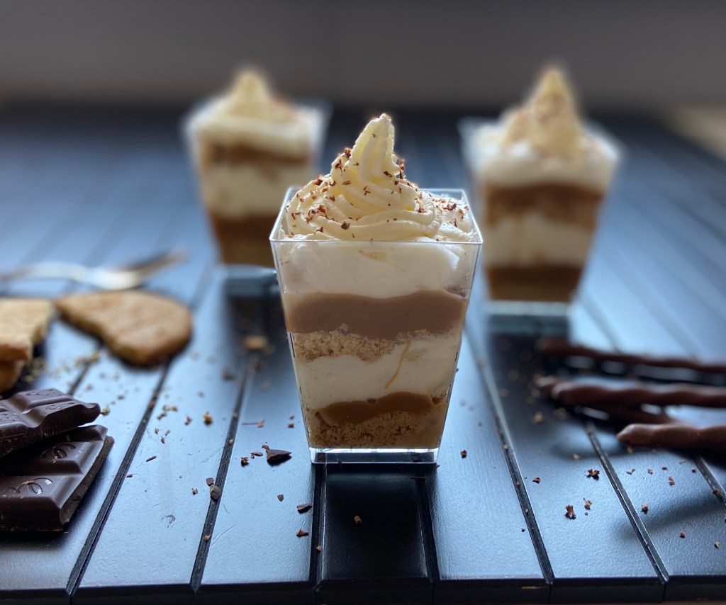 Start layering in the following order -> crushed biscuits – banana slice – Dulche de Leche – whipped cream mixture – crushed biscuits – banana slice – Dulche de Leche – whipped cream.