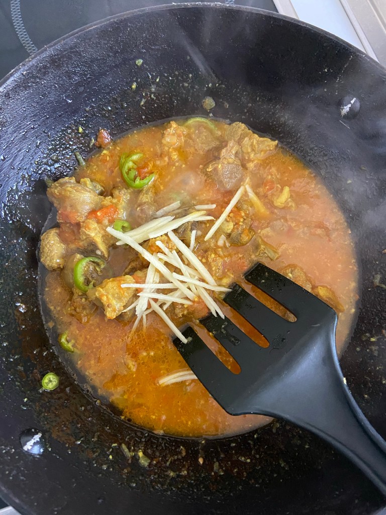 Transfer this mixture into a Karhai (Wok) or wide surfaced saucepan. Cook on high flame whilst stirring continuously. The objective is to dry up the water content. As you simmer add oil and ginger. If you prefer spicy food, feel free to add 1 more sliced green chilli at this point. Once the oil begins to surface, add yogurt and keep simmering. Don’t forget to stir at regular intervals. Season with black pepper, garam masala powder, cumin and coriander. Add butter and cream as it starts bubbling. Once the gravy has thickened and oil has separated, sprinkle with finely cut fresh coriander and ginger. Serve hot with naan, chapati or bread of your choice.