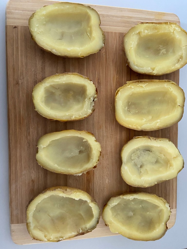 Once cooked, allow the potatoes to cool down a bit. Cut them into halves using a sharp knife. Using a small spoon, hollow out the potatoes to resemble a boat shape. Be careful not to break the potato skins. I have left the potato lining a bit thick as I was working with thin-skinned early potatoes. The thinner you keep your potato lining the crispier your potato skins will be.