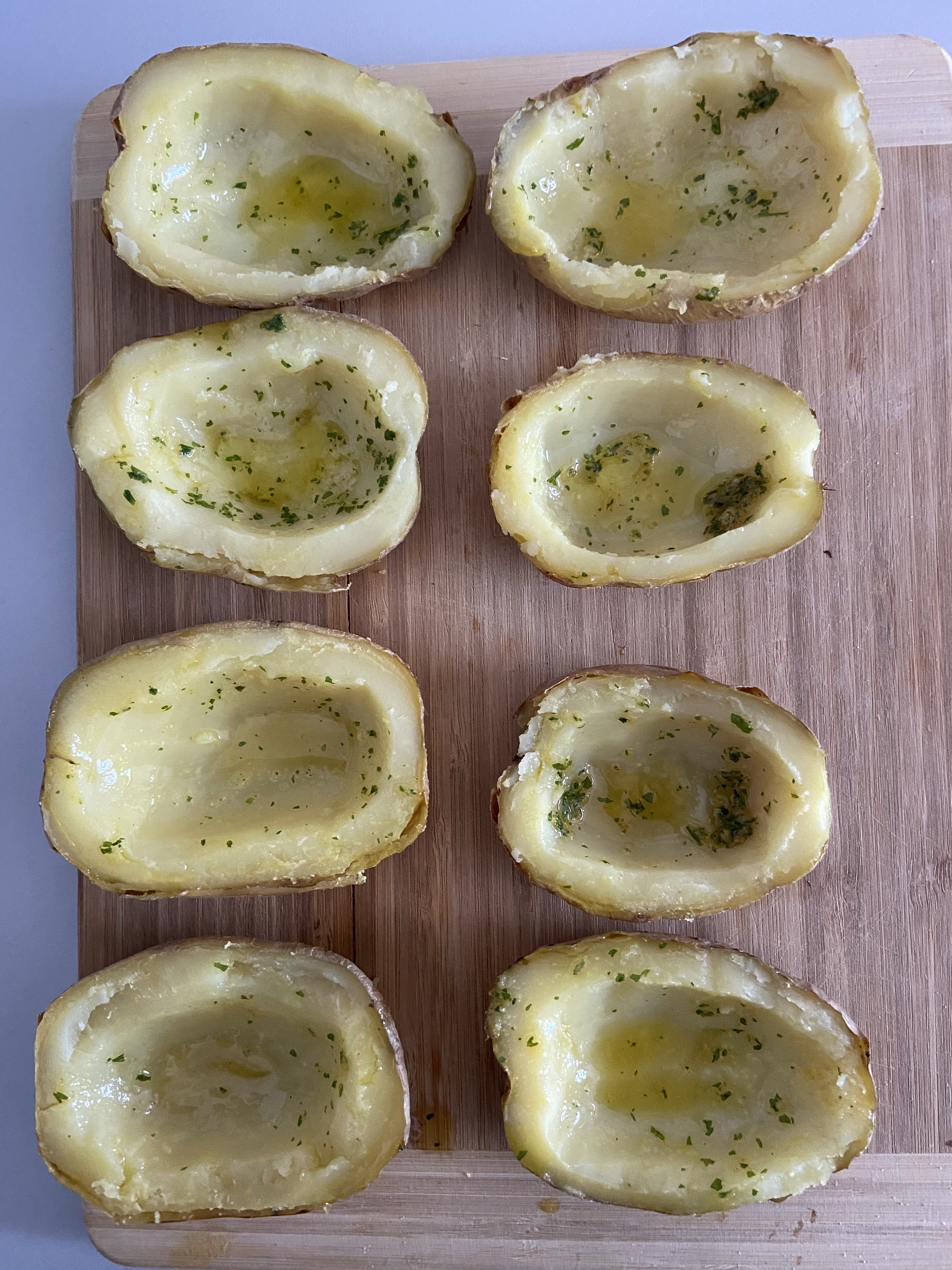 Melt butter and add finely chopped parsley, garlic powder and salt to it. Brush the inside and outside of the potatoes with herbed butter.