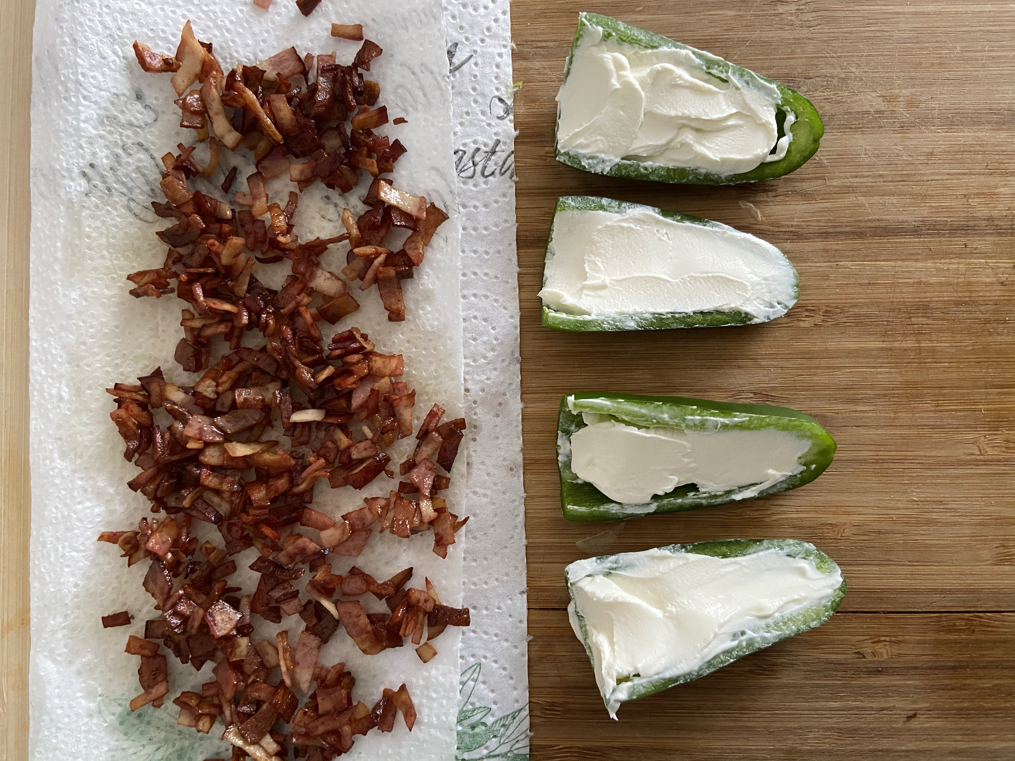 Cut a Jalapeno into halves and clean out the seeds. Fill the jalapeno cavity with cream cheese. Place stuffed jalapenos into prepared potato skins, add turkey bacon bits and cheddar cheese. Broil at 200℃ till cheese is melted and bubbly.