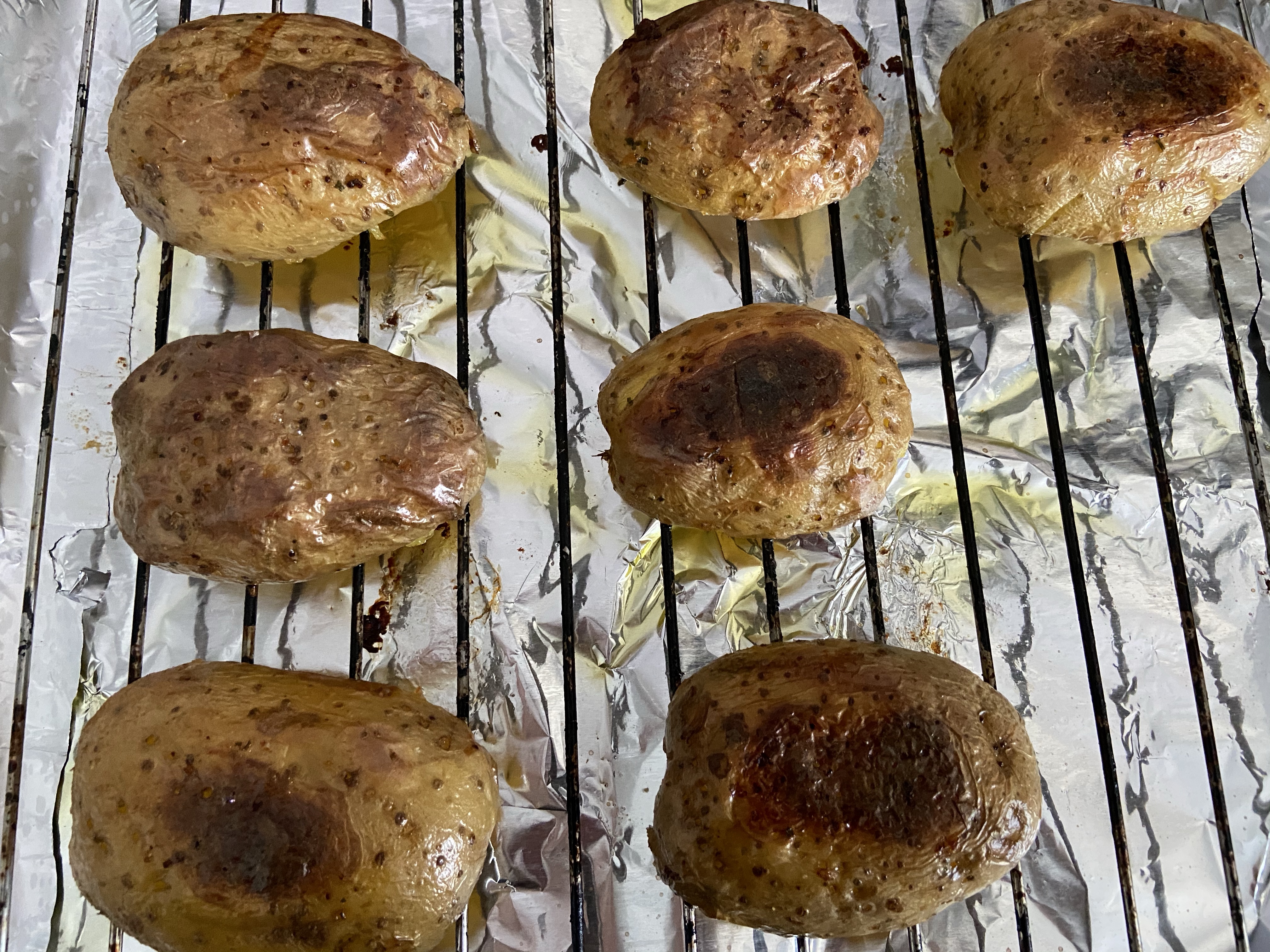 Scrub the potatoes clean and pat them dry with a paper towel. Pierce washed potatoes with the tines of a fork. This will help steam to escape from the potatoes as they bake. Rub some oil onto the potatoes. Line a tray with foil and bake potatoes at 180℃ for 40-50 minutes. Keep checking at regular intervals until the potatoes are soft enough that when a wooden skewer is inserted it goes in smoothly.