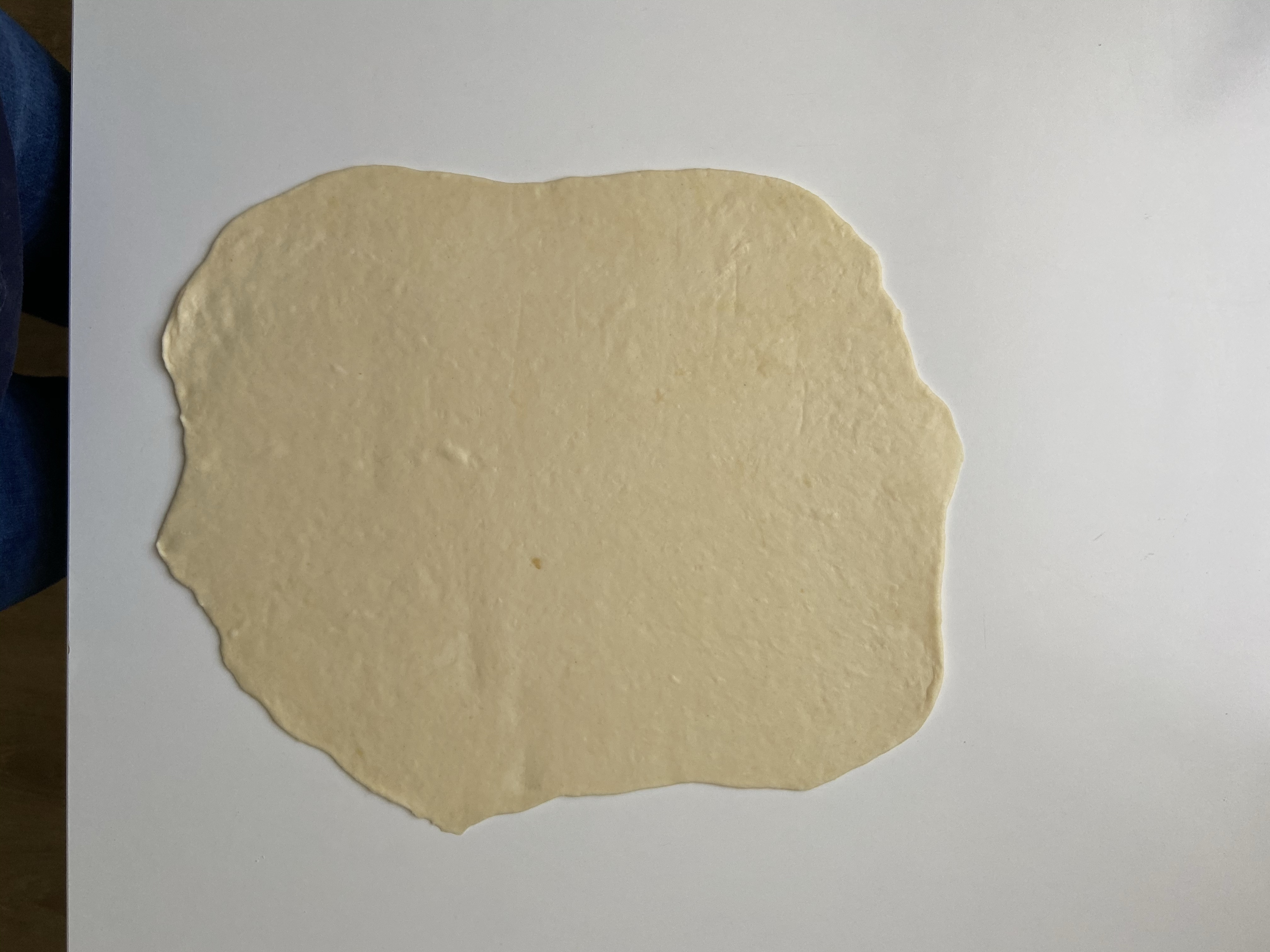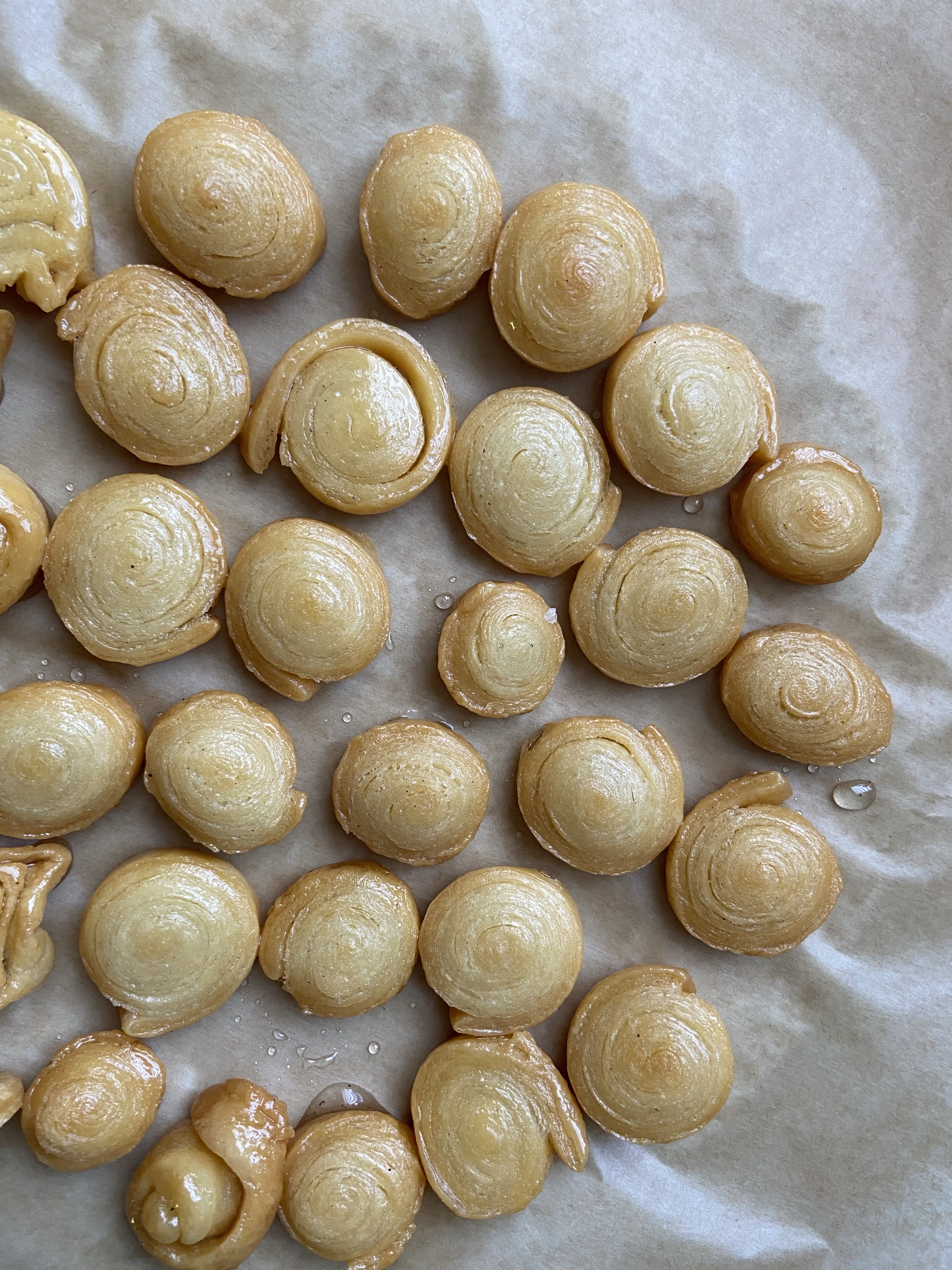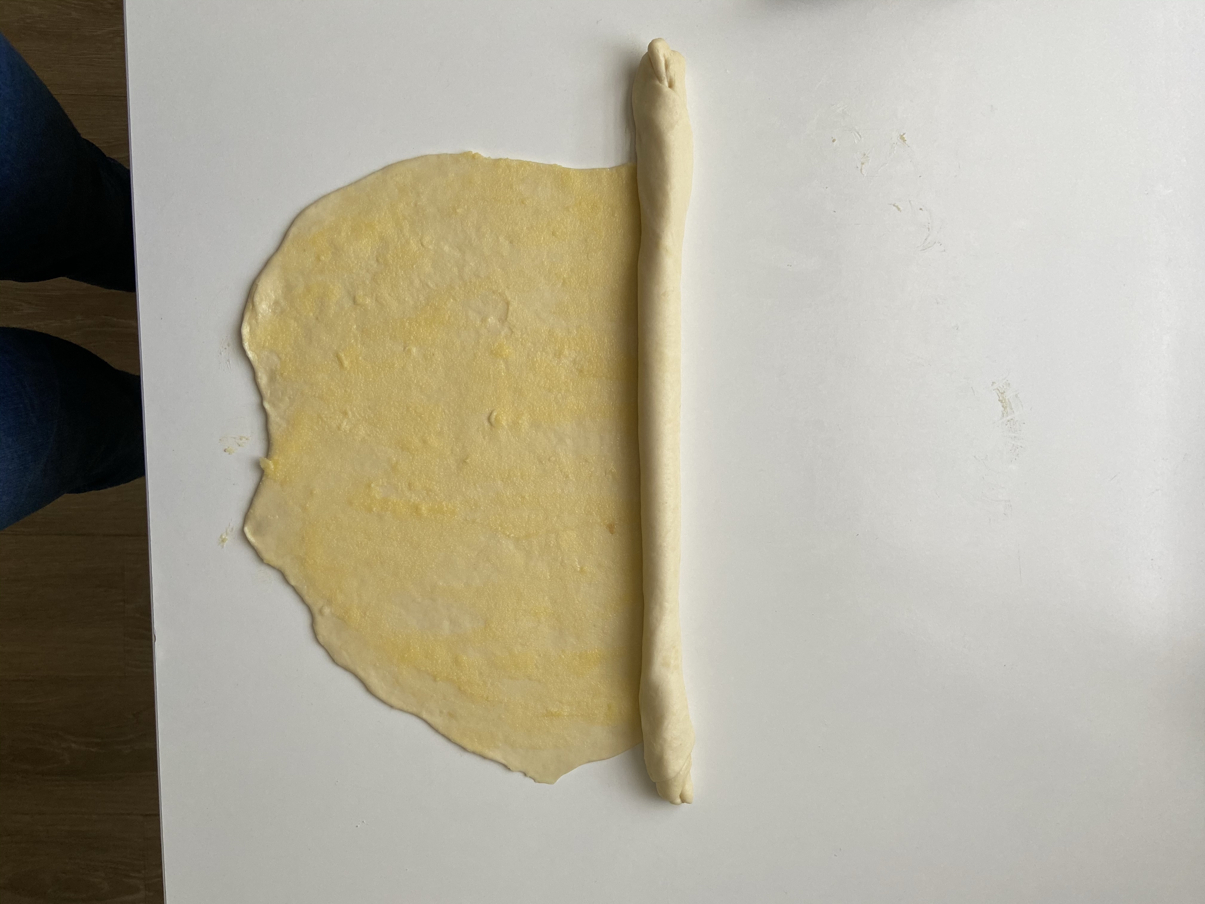 After 15 minutes knead the dough for 2 more minutes. The dough should be stretchy yet soft. Divide the dough into two balls. With the help of a rolling pin roll out each ball very thinly (about 1-2 mm) on your kitchen counter and spread a very thin layer of ghee on its surface. Roll dough into a tight swiss roll, and using a sharp knife cut into 1/4 inch cylinders.