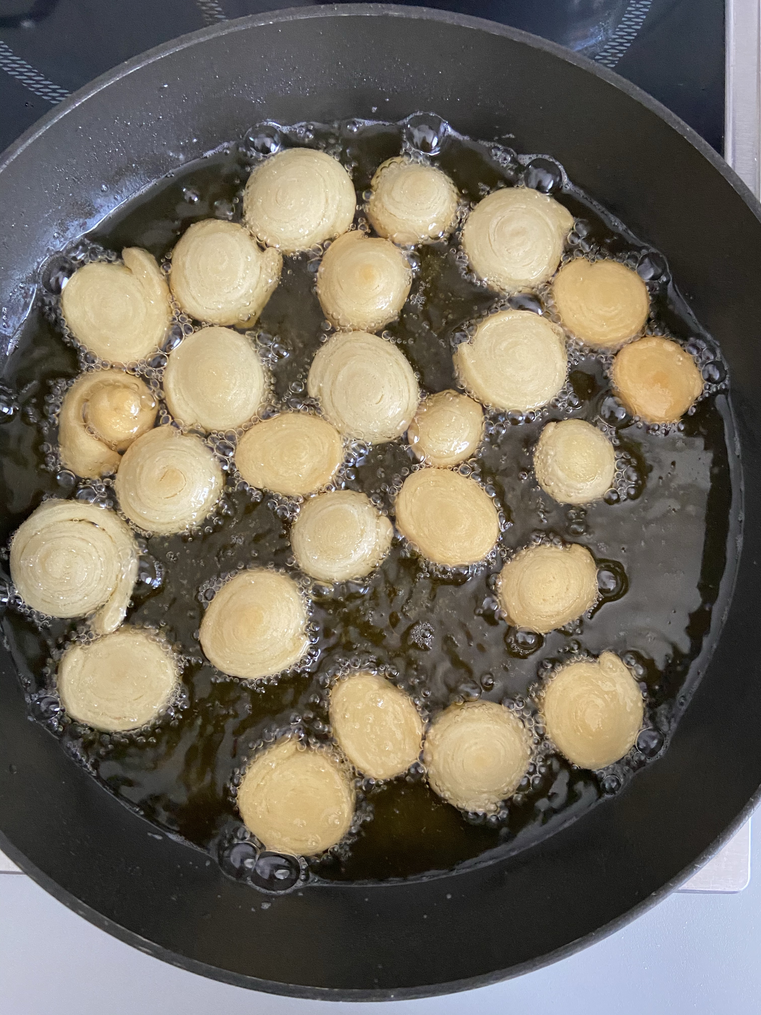 The dough for this recipe is fairly basic, the syrup used to glaze fried Shakar Paray however requires some patience. You need to coat these Shakar Paray in a ‘2 string sugar syrup’. 2 string is an Indian method to test the consistency of a syrup. Once the sugar has dissolved and syrup starts to bubble, you can check for the consistency of your syrup by taking a slightly cooled drop of syrup between your thumb and index finger. When you pull your fingers apart you will see strings of sugar syrup webbed between your fingers. If there is no string, it means the syrup has not reached the desired consistency. If 1 string forms, the syrup is almost there for this recipe (Some recipes like Jalebi, Gulab Jamun etc. call for 1 string sugar syrup, so you can stop here). For Shakar Paray continue to cook the syrup until 2 strings form between your fingers. For better understanding I have attached some pictures in the Method section.