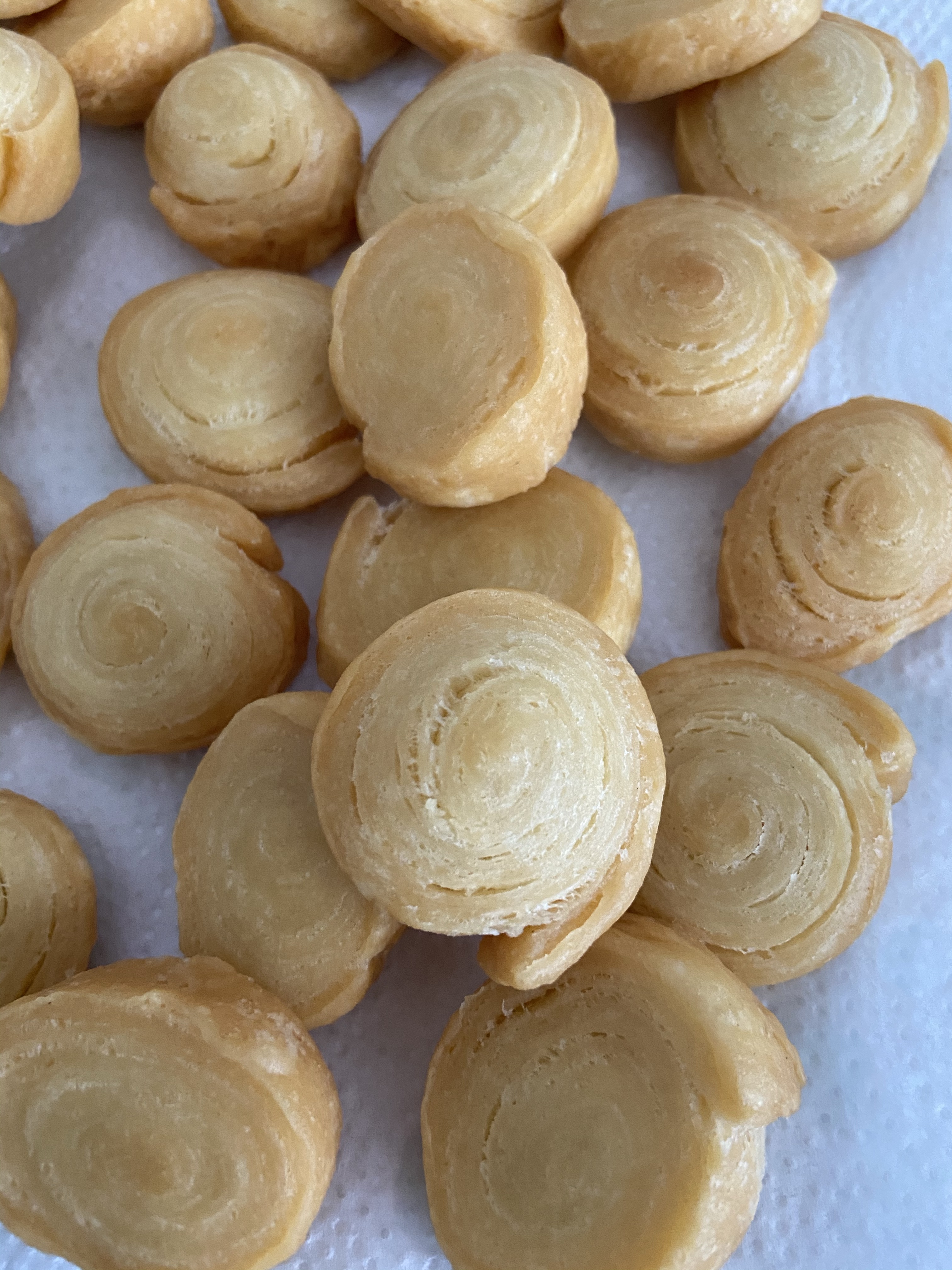 Fry rolled cylinders on low heat till golden. Once Shakar Paray are golden, transfer them to a plate lined with absorbent paper with the help of a slotted spoon.