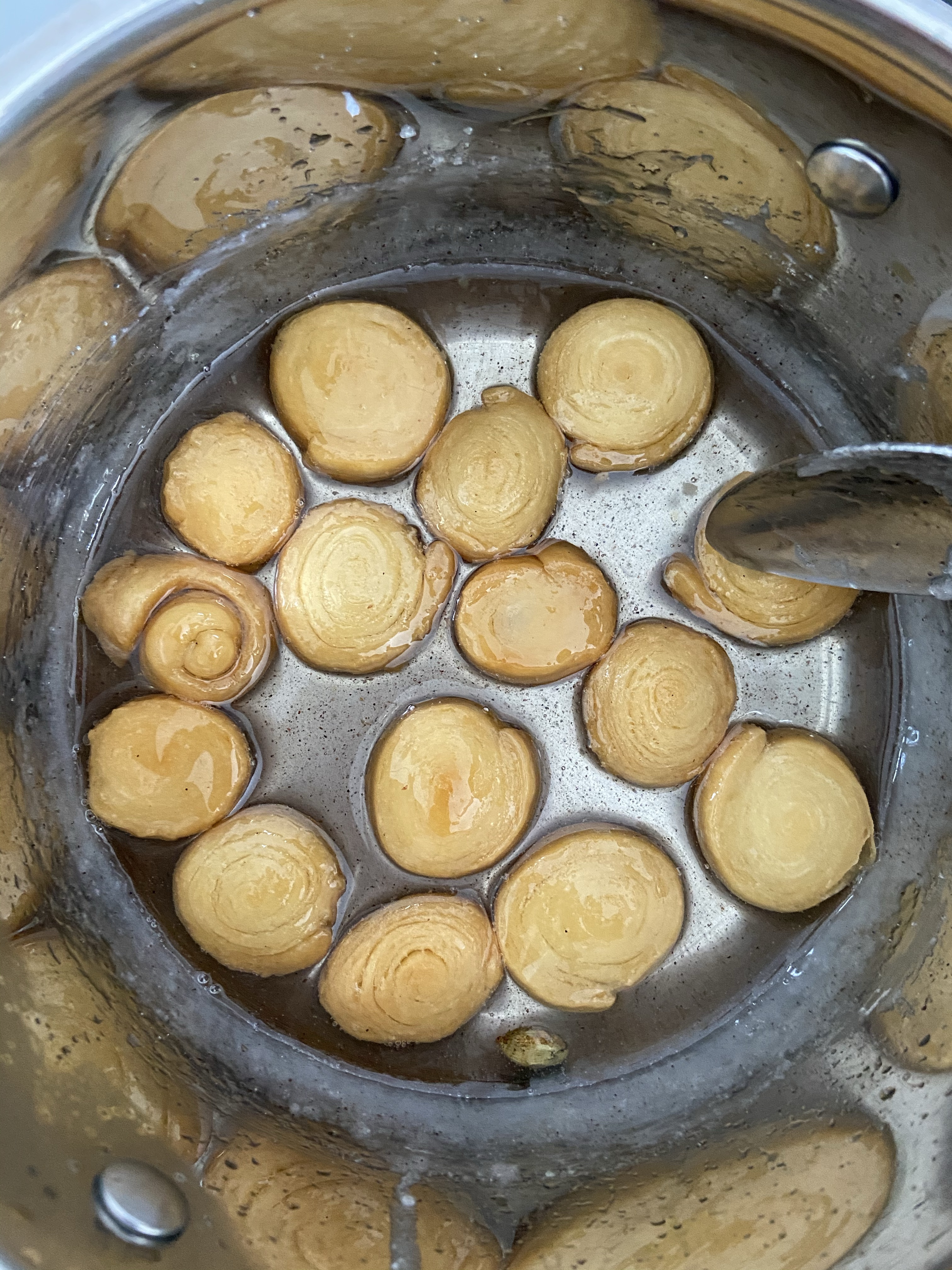 To make the sugar syrup combine water and sugar in a pot with cardamom and cardamom powder. Gently cook on medium heat until sugar is dissolved and syrup begins to thicken. To test the consistency of sugar syrup, place a slightly cooled drop of syrup between your index finger and thumb. When you pull both fingers apart 2 strings of syrup should be visible between your finger and thumb. For visual cue check pictures attached below.