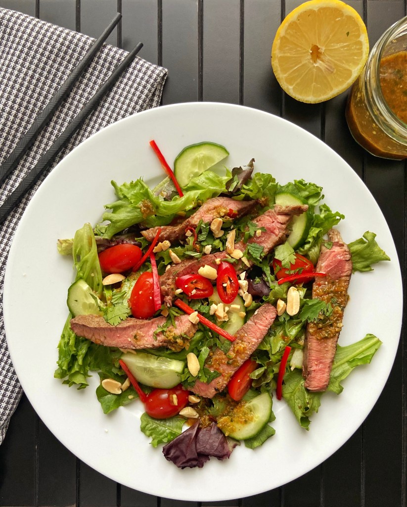 A Thai Beef Salad is one of the most popular Asian salads. Juicy strips of delicious beef tossed with crisp vegetables and crunchy peanuts glazed in a tangy slightly spicy dressing. I recommend you use a nice cut of quality beef to elevate this simple salad to the next level. You can cook the beef to your desired temperature, I however feel cooking a premium cut of beef beyond medium should be illegal.