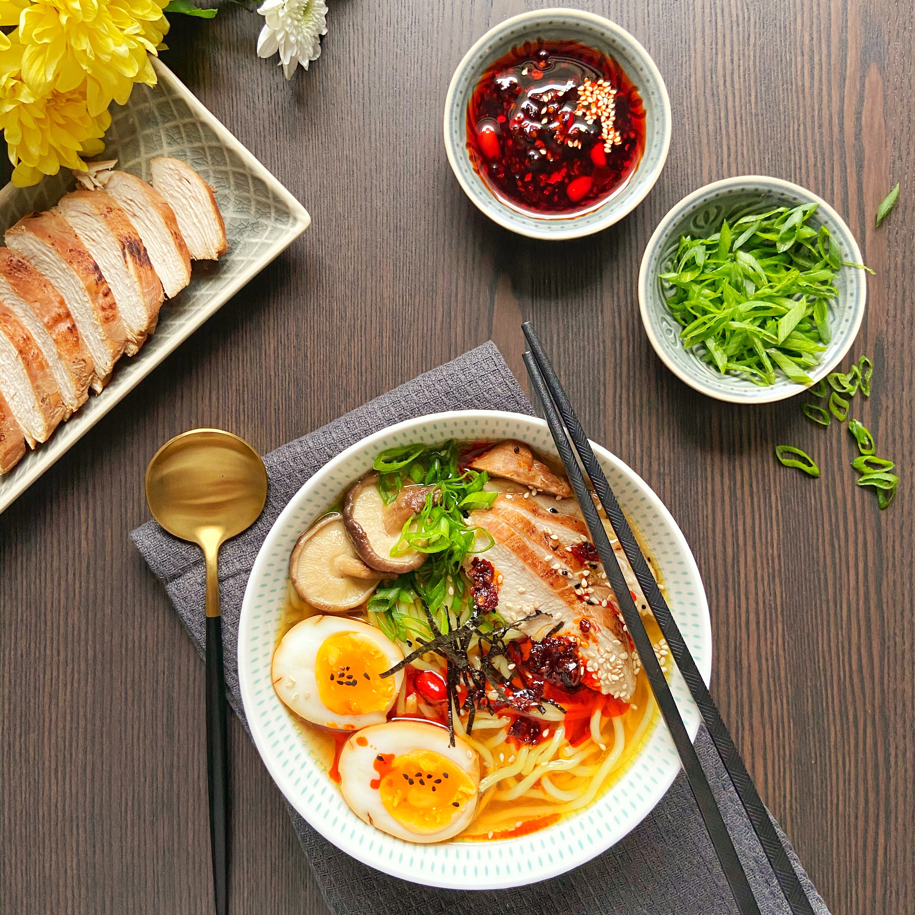 To assemble Ramen start by placing cooked noodles in a deep bowl. Ladle on hot Dashi until noodles are submerged. Top with slices of chicken, marinated egg cut into half, 2-3 tsps of reserved braising liquid, 1 tsp of chili oil, 2-3 pieces of Shiitake mushroom, green onions and nori.