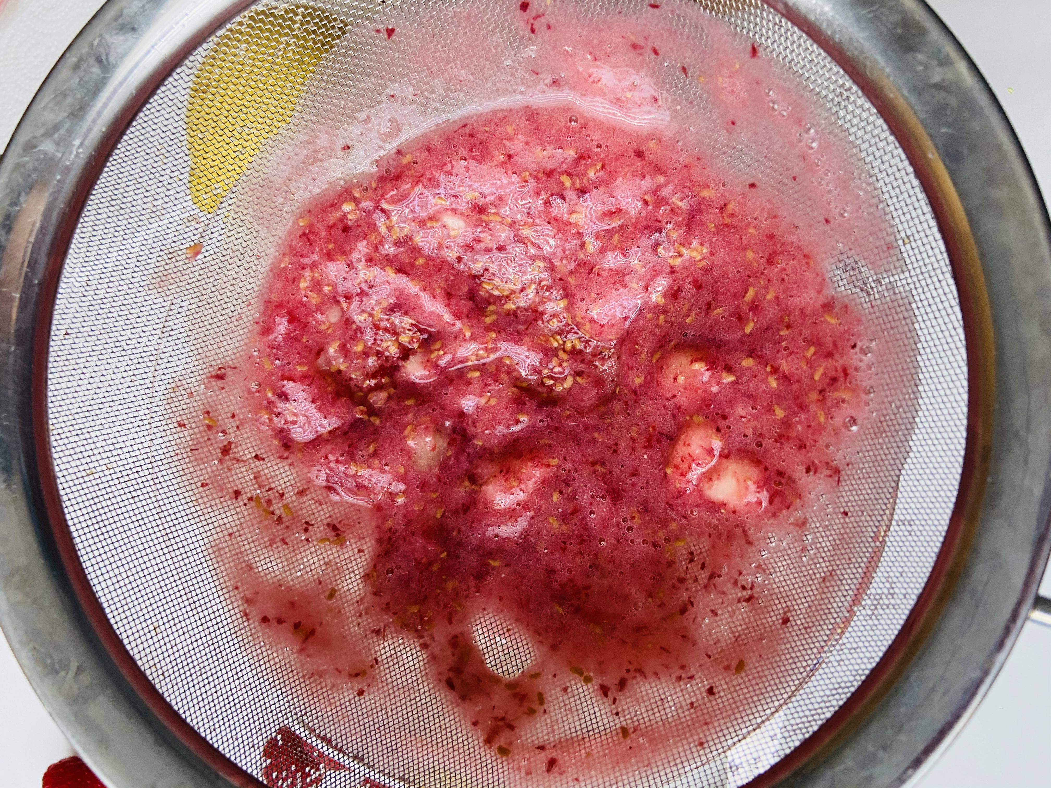 To make the syrup combine peaches, raspberries and water in a blender or food processor until smooth. Strain this puree through a fine sieve placed over a bowl and discard the seeds and skins.