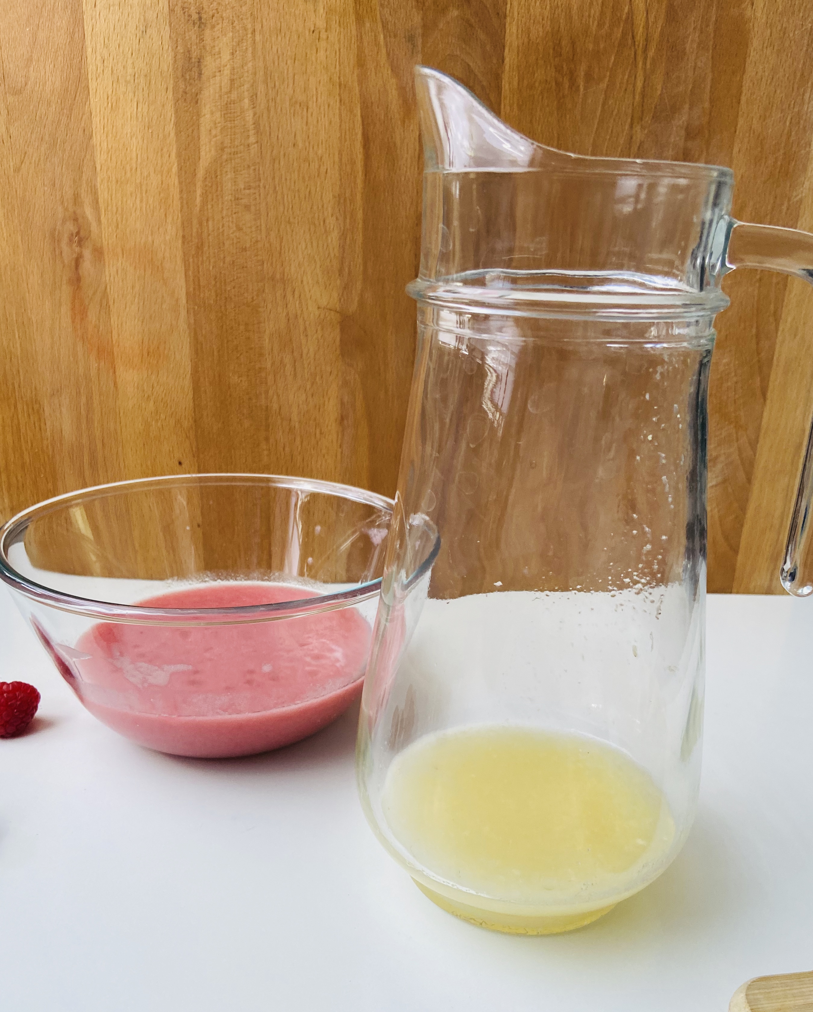 - Then make a standard lemonade and mix in the peach and raspberry juices.