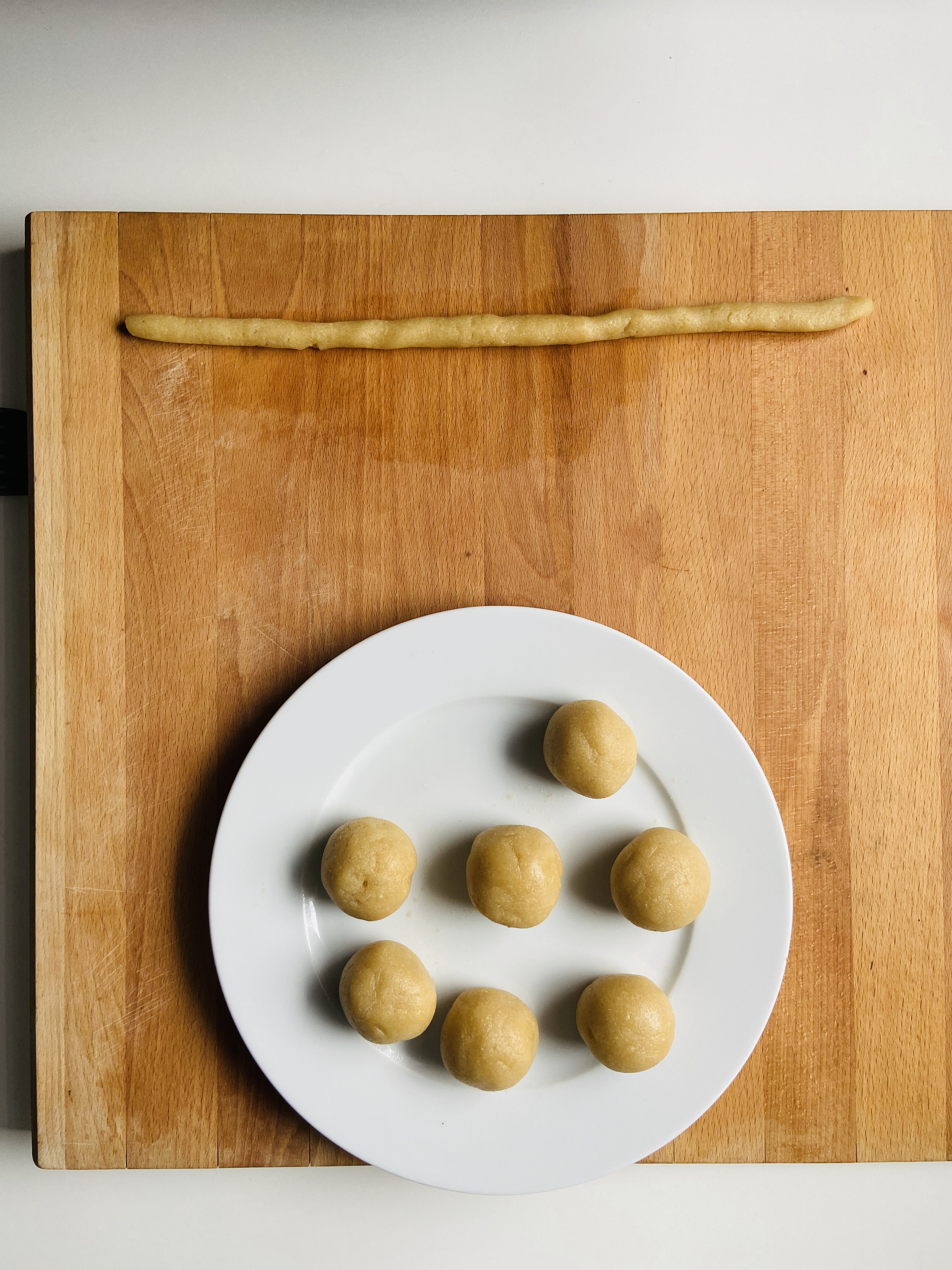 Remove almond filling onto a plate and divide into 8 equal portions. Roll each portion into a long cylinder. The length of your rolled almond filling should be equal to the long side of your phyllo pastry. I am using a 30 cm x 15 cm piece of pastry, so I have rolled each portion of Almond filling into 30 cm long cylinders. I have attached step by step pictures and a video for clarity.