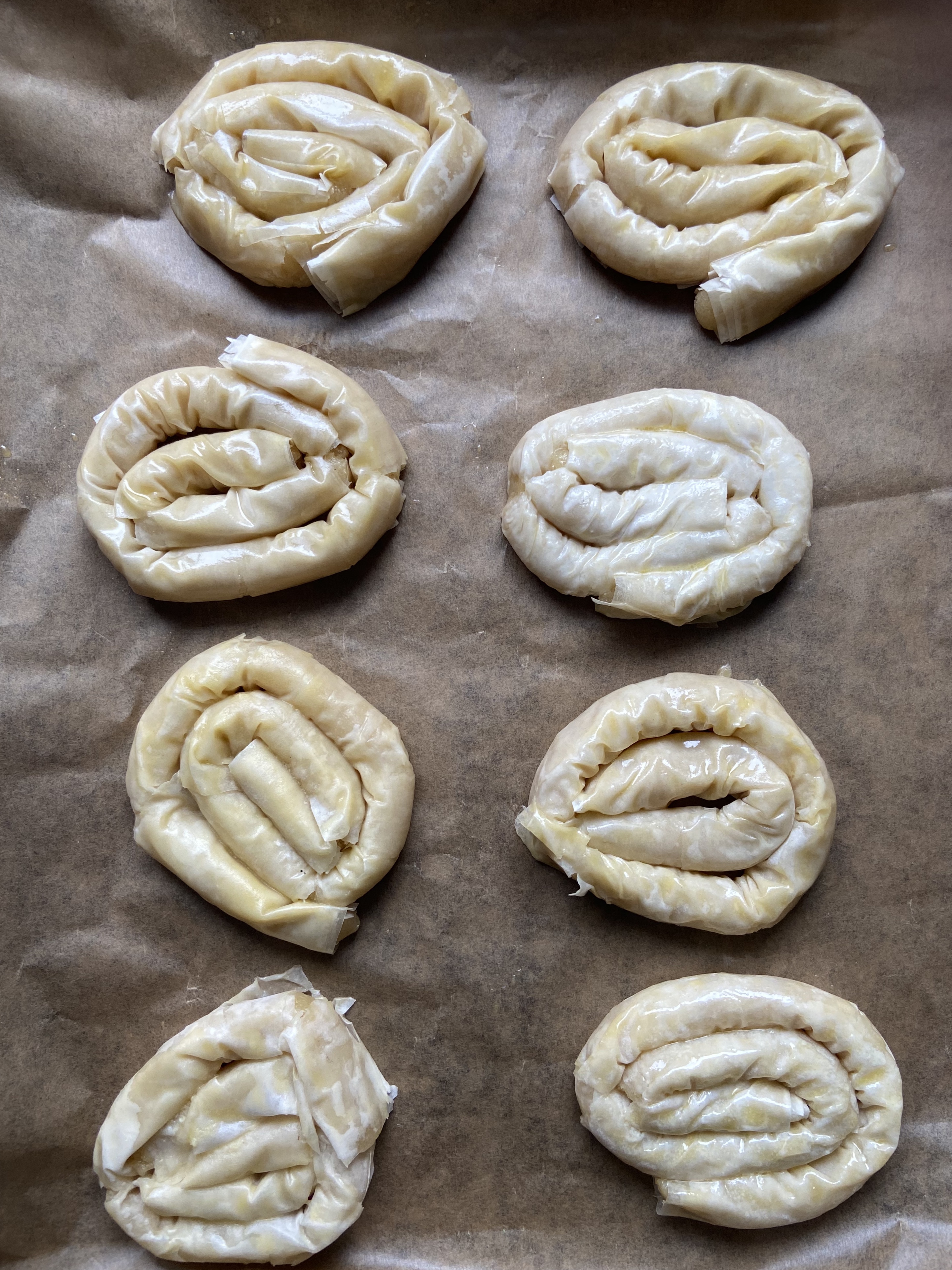 Carefully lay 1 sheet of phyllo on a work surface. Brush the whole sheet carefully with melted butter. Place the rolled almond filling along the edge of the phyllo sheet. Start rolling until you reach the edge. The fold the phyllo covered almond filling into a spiral. Do not roll too tightly as the phyllo will start to break. Transfer rolled spiral of M’hencha onto a lined baking tray. Brush melted butter on top. Repeat process until all phyllo sheets and filling are used up.