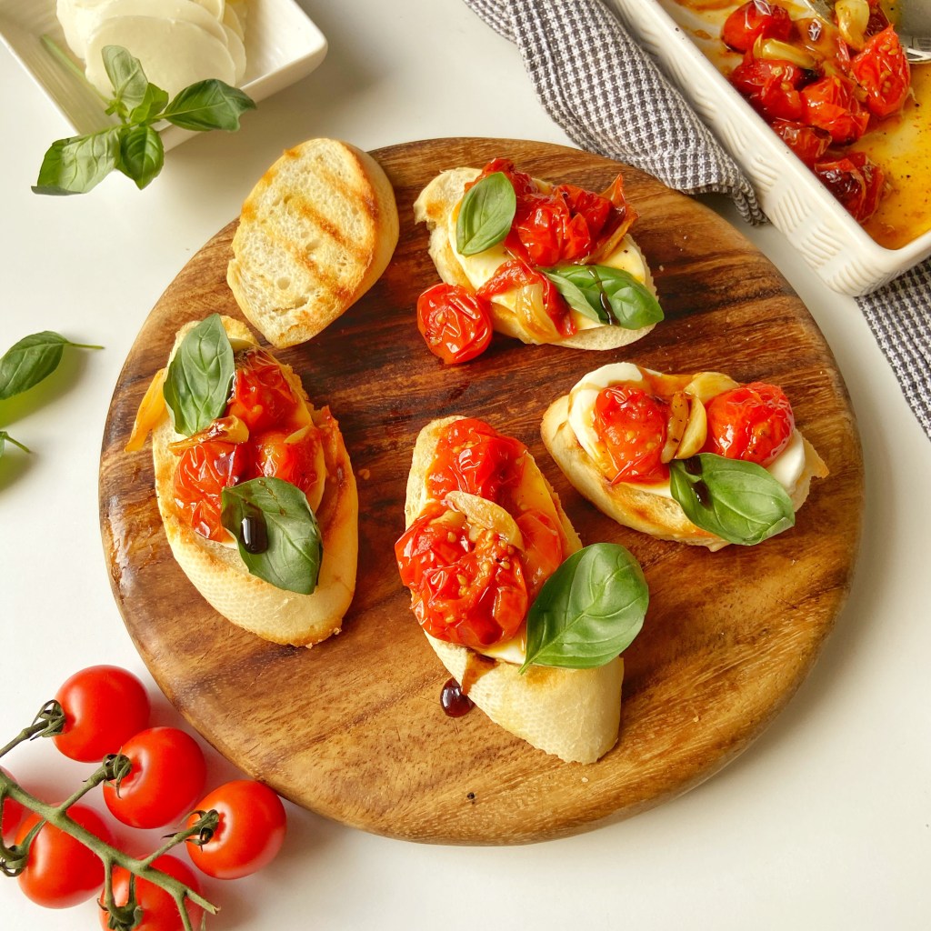 - To assemble Bruschetta place sliced mozzarella over toasted bread. Spoon 1 tablespoon of roasted tomatoes along with juices on top. Repeat the same on all slices.
